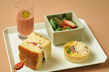 セイボリーでは、イチゴの風味を濃縮した「ストロベリーのガスパチョ」、甘酸っぱいイチゴと濃厚なブラータチーズの絶妙なマッチングが楽しめる「フォカッチャサンドイッチ」など、一口ごとに春の訪れを感じるラインアップです。
