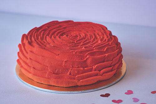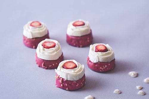 アーモンドフィナンシェの上にストロベリー、ライチ、ローズゼリーをのせ、爽やかなストロベリームースで包みました。贅沢にトッピングした京都産イチゴとともにお楽しみください。
