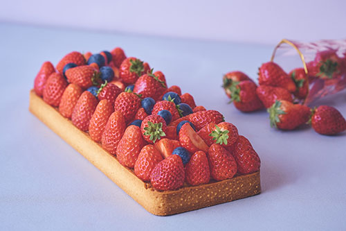 みずみずしい京都産イチゴをたっぷりと飾った華やかなタルト。サクサクのタルト生地に濃厚なバニラカスタードクリームを重ねました。