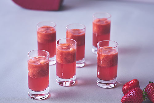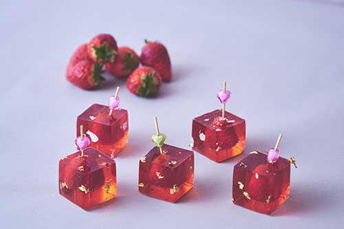 華やかなロゼスパークリングワインの香りと、みずみずしいイチゴを閉じ込めたキューブ型ゼリー。ロゼスパークリングワインの上品な風味とイチゴの甘さが口の中で広がります。