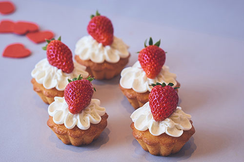 みかんのパウンドケーキにバニラクリームとフレッシュイチゴをトッピングしました。バターをたっぷり使用したパウンドケーキを口に入れると豊かな香りが広がります。