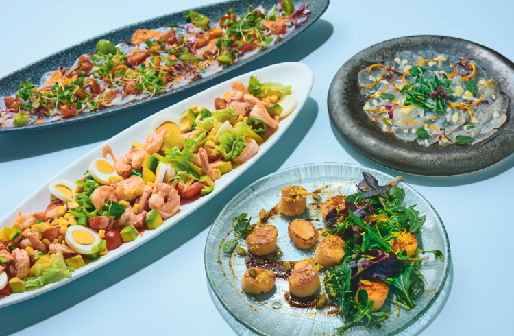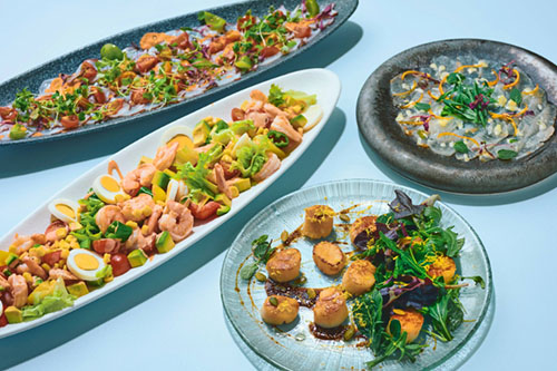 爽やかな「鯛のマリネカルパッチョ仕立て 柚子西京味噌」、豊かな風味の「ホタテのソテー イチジクとバルサミコ酢ソース」そしてみずみずしく軽やかな「タコのマリネ、フレッシュトマトソース、オレンジ」など素材の魅力が引き立て合うフレッシュな味わいを堪能いただけます。