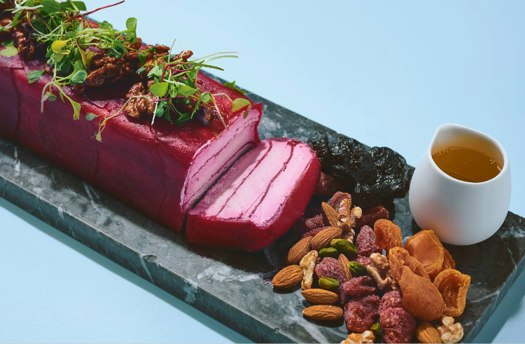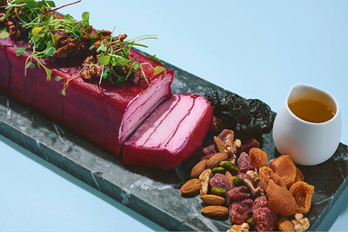 深紅のビーツに包んだクリームチーズのテリーヌはフランス料理をベースにした一品。
