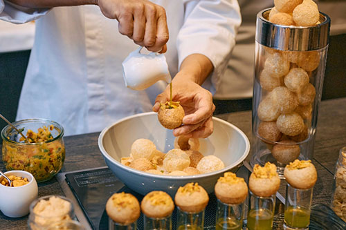 「パニプリ」はインドのスナック。小さな揚げ生地の中にスパイシーな豆や香草を詰め、爽やかな酸味の“パニ”(スパイスウォーター)を注いで一口でどうぞ。